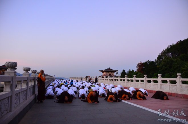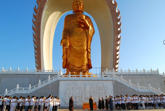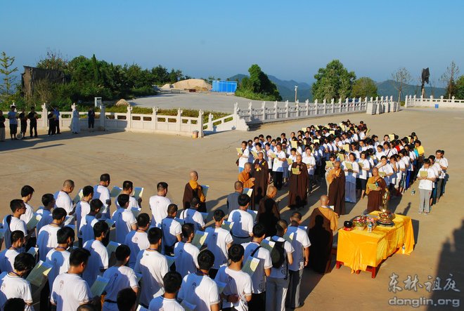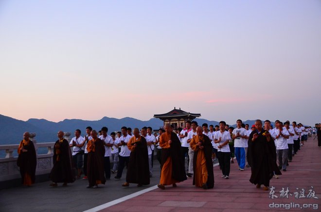 2013年8月9日,青年学子参礼祖庭活动进入第二天,上午的安排是拜东林大佛。早上4点整,全体学员总计两百多人在香光讲堂集合,分七个小组乘坐大巴前往东林寺净土苑。因不能在斋堂用早餐,护法团的义工们为大家准备了面包、榨菜、饮料和水。仰望天空,竟是满天的星星。