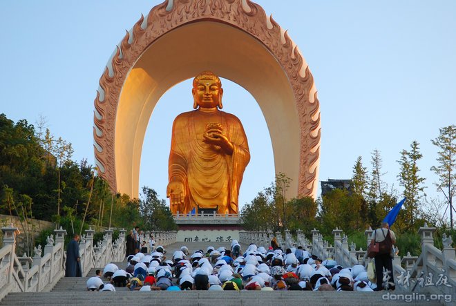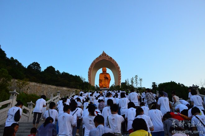 行车约半小时,汽车驶入净土苑,远远地便可看到山顶上巍然耸立的阿弥陀佛圣像,柔和的灯光映衬之下,圣像慈容尽收眼底,学员们由衷地发出赞叹之声。