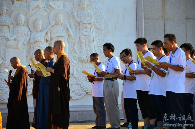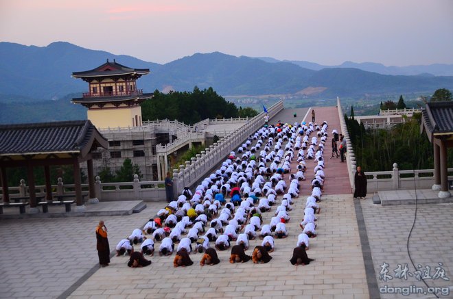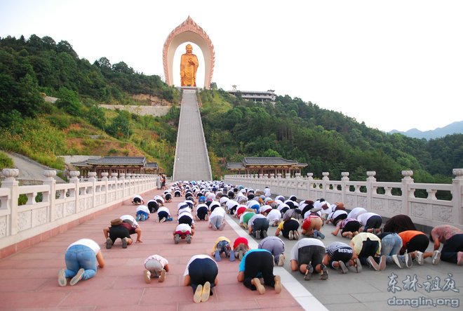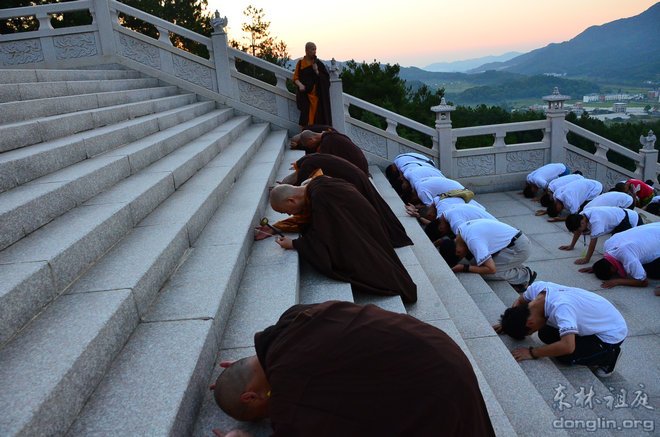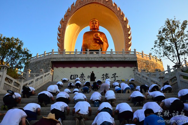 性空法师作了简短的开示,出家师排前,学员紧随其后,随着师父的口令,队伍三步一拜拜向大佛台。朝拜的场面震撼人心,非常壮观,学员们身着洁白的队服,仿佛一朵朵洁白的莲花开放在金色的朝阳之中,莲花如云,慢慢地飘向阿弥陀佛的莲花宝座。随着距离越来越近,五个大字映入眼帘:回来吧,孩子!抬头望去,阿弥陀佛正垂着金色的手臂召唤我们,有的学员流泪了,轻轻地抽泣,仿佛迷路的孩子回到了父母的怀抱。当大家拜到大佛脚下时,全身已汗水湿透,但心里却是喜悦清凉的感觉,有的学员长跪大佛脚下,感受到阿弥陀佛的慈悲与接引,悲喜交加,难以自抑,哭出声来,感恩佛菩萨的加持!拜佛的功德殊胜无比,不可思议!