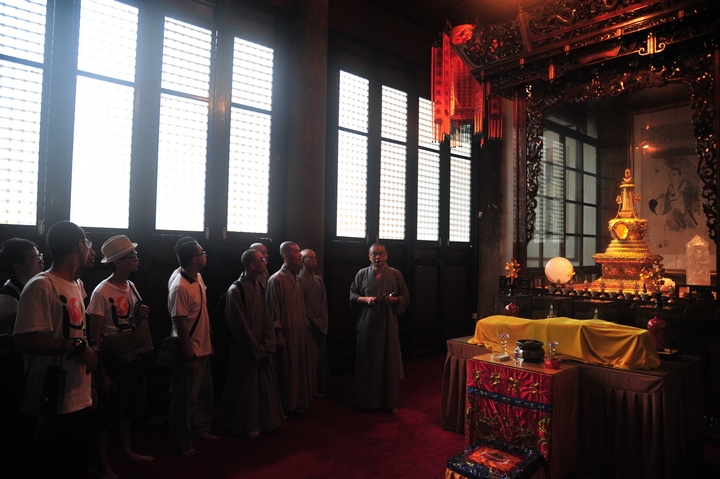 宏开法师带领参访团的法师及志愿者沿着文殊院中轴线参观