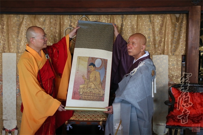 光泉法师赠送则竹秀南长老丝织灵隐寺释迦牟尼佛像卷轴