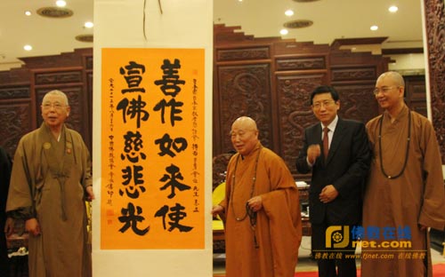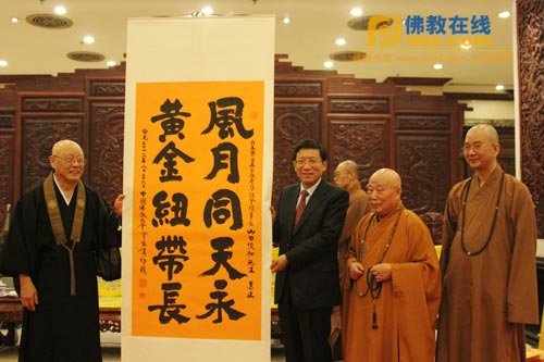 中佛协传印会长向日本日中友好宗教者恳话会会长、日莲宗本山藻原寺住持持田贯宣赠送墨宝“善作如来使 宣佛慈悲光”