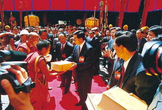7月18日、21日,为庆祝西藏和平解放50周年,以国家副主席胡锦涛为团长的中央代表团参观了拉萨大昭寺、日喀则扎什伦布寺,并向寺院赠送《大藏经》,向僧众发放布施。(见图)