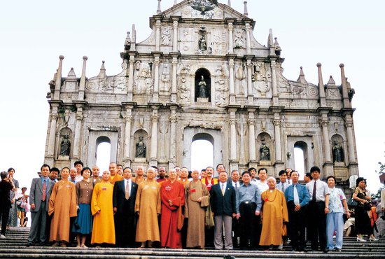 5月21日至29日,为庆祝香港特区政府首次将佛诞日定为公共假日,中国佛教协会会长赵朴初率团护送佛牙舍利赴香港供奉。(图为佛牙舍利护送团之后访问澳门时合影)
