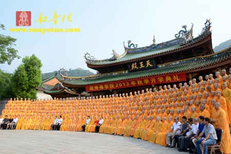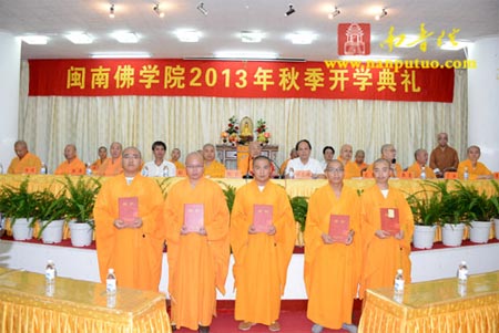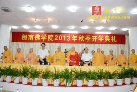 2013年9月1日,在第29个教师节来临之际,闽南佛学院2013年秋季开学典礼于南普陀寺讲堂隆重举行。全国人大代表、中国佛教协会副会长、闽南佛学院院长圣辉法师,厦门市佛教协会会长、南普陀寺方丈、闽院院务委员会副主任则悟法师,市佛协常务副会长定恒法师,南普陀寺慈善会常务副会长慧然法师,闽院图书馆馆长了法法师、常务副院长界象法师、副院长法源法师、副院长兼教务长传明法师、副院长兼教导长净心法师,办公室主任界淞法师、副主任悟源法师、副主任际亘法师、副主任延明法师,副教务长中观法师、静安法师,副教导长法仪法师、超波法师等学院领导,以及厦门市委统战部副部长、民宗局局长曾文瑛,一处处长沈仲勇,南普陀寺实业社主任曾全民等出席典礼并于主席台就座。会议由常务副院长界象法师主持,闽院全体法师、老师及学僧参加了开学典礼。