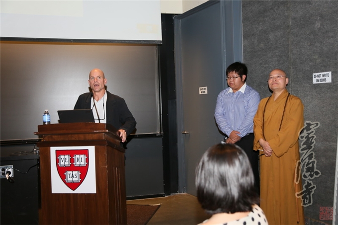美国哈佛大学东亚语言与文明系教授James Robson(詹姆士·罗伯逊)代表校方欢迎光泉法师一行的到来,他说,哈佛大学有个佛字,说明它跟佛教很有缘,这次能请到中国著名古刹灵隐寺的方丈光泉法师来校弘传佛教文化,很幸运,也很殊胜。