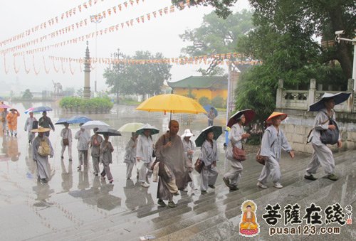 导读:9月4号,“重走行思路” 行脚的第十二天,也是最后一天,离目的地南华禅寺还有二十公里。队员们怀着无比崇敬、激动的心情敬香,拜佛、绕佛,费尽千辛万苦走到这里终于得见祖师真颜,那种心情无法言表,热泪盈眶,深深拜倒尘埃…… 中国禅宗网转 2013年9月4号,“重走行思路” 行脚的第十二天,也是最后一天,离目的地南华禅寺还有二十公里。 早上5点30分队伍出发了,7点多时在大塘镇黑石村路边吃早餐,9点50分行脚到演山村时下起了毛毛雨,大家都说这是天降甘露。 上午途中休息时,队员纷纷在106国道2239路碑处留影,这里离南华寺很近了,队员的行程即将结束。 中午饭后演宝法师、慈照法师、演袈法师都讲了开示,演宝法师开示说:行脚时有没有守住话头,有没有念佛,有没有学习别人的长处,如果有的话那你行脚才有些收获。 下午一点左右天又开始下雨,队伍冒雨行进,临近南华寺的路上每隔一段路就有一个广告牌,上面写着《六祖坛经》法语。一点五十分来到了南华禅寺祖师殿“拈花笑处”,这座祖师殿建在南华寺与南向加油站之间,106国道一侧,大殿宏伟壮观,殿内供奉着禅宗六祖法脉曹溪宗派一花五叶传承下来的历代祖师的铜像88尊,各位祖师大德法相庄严,栩栩如生,正面大厅是虚云老和尚法相,队员在这里感受到了佛文化的精髓,徜徉在浓郁佛文化氛围之中,团长领着众人礼祖并绕佛三圈,然后在殿外合影留念。慈照法师即兴作诗一首: 参南华禅寺祖殿前菩提树题 佛陀圆成觉有情 祖言《菩提本无树》 法宝坛经树正法 灯传明心见性灯 下午两时四十分,队员行脚团风雨兼程,终于来到了禅宗祖庭南华禅寺,队伍排班列队整齐的步入山门,来到客堂到。9月7号这里举办 “纪念六祖惠能圆寂1300周年暨2013广东禅宗六祖文化节”大型法会,闻讯来此参会者众多,客堂早已止单。常住慈悲,格外照顾我们这支千里迢迢徒步朝圣的队伍,帮我们安住下来,安排八位比丘法师住进了禅堂,在法会期间这是最高的礼节,又安排其余的26位队员住进义工楼,大家非常的满足,非常的感恩。常住还破例让我们到六祖肉身殿礼拜六祖真身,(法会期间六祖肉身殿不对外开放。)队员们怀着无比崇敬、激动的心情敬香,拜佛、绕佛,费尽千辛万苦走到这里终于得见祖师真颜,那种心情无法言表,热泪盈眶,深深拜倒尘埃…… 今天是地藏王菩萨圣诞,特别的殊胜,队员不顾路途劳累,晚上七点二十分又来到祈福堂随众诵地藏经。 跪在佛前,队员们把行脚朝圣的功德做了回向: 愿以此功德回向无上菩提!佛法兴隆,正法久驻,法轮常转! 回向战争消除、世界和平、国泰民安! 回向法界一切众生得利益、得快乐、得解脱! 回向妙安大和尚法体安康、弘法顺利、违缘消除! 回向净居寺常住法师法体安康、持戒精进、道业早成! 回向行脚团全体成员身体健康、道业早成、家人安乐、所愿皆满! 回向天下所有修行的人们道心坚固,精进勇猛! 回向所有看到、听到、读到、参与此次行脚活动的人们都吉祥如意,所愿皆满!终成佛道! 青原山净居寺“重走行思路,朝礼南华寺”行脚朝圣活动到此圆满结束。阿弥陀佛!