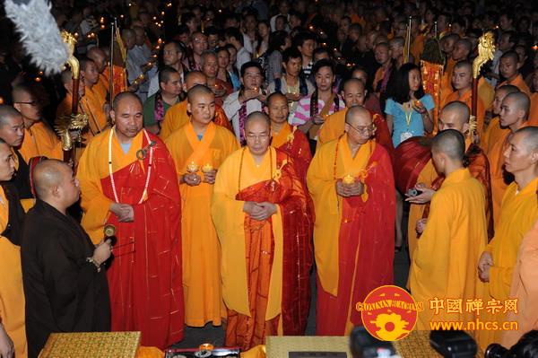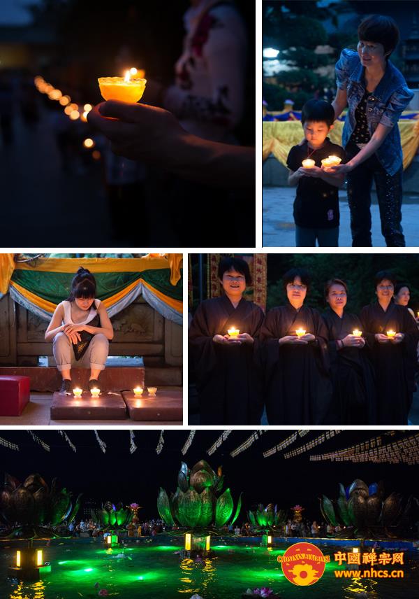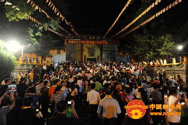 僧侣和信众排成两行,执莲花灯,边走边诵禅经,从大雄宝殿向曹溪山门缓缓行进。从大雄宝殿至山门外,沿途摆满各色莲花,灯火摇曳、树影婆娑,曹溪山门前,万灯辉映,广场正中,代表着禅宗一花开五叶的巨型铜雕闪烁着五彩霓虹,在朦胧夜色中宛若五朵盛开的巨莲,令千年古寺更显得无比的庄严、神圣。