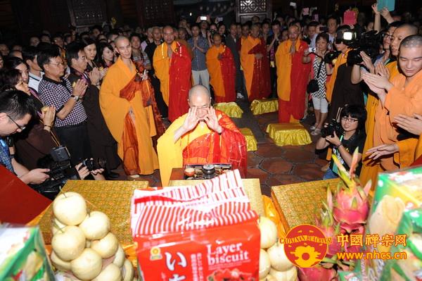 下午18时30分,“万灯耀祖庭”传灯法会正式开始。这是南华寺首次同时为六祖惠能、憨山、丹田三位大师的真身更换法衣。南华禅寺大雄宝殿内,方丈传正大和尚主法拈香,齐唱《炉香赞》、诵《心经》祈福。传正大和尚说传灯偈,信众夹道而立,传正大和尚点燃第一盏光明灯,辗转传至信众,共念“南无本师释迦摩尼佛”。