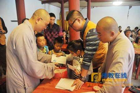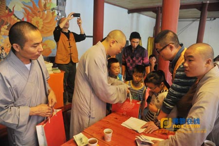 在稍后的互动环节中,学生及家长们纷纷表达了感激之情。一位刚上初中一年级的男孩子双手合十,真诚地说:“感恩文殊院对小孩子、对残疾人的关心!”受助的55名贫困学生包括幼儿园学生1人,小学生19人,初中生17人,高中生12人,大学生9人。他们有的由父母陪伴,有的由外婆奶奶带着,还有的孤身一人,因为在这些学生中,有的已经在惨烈的4.20芦山地震中失去了家人。为了参加助学活动,有的学生凌晨4点就起床,经过车马劳顿,甚至翻山越岭才感到佛图寺;还有的家长说,家里因为得知文殊院要帮助他们的孩子解决读书的经济负担,高兴得两天都没睡着觉。