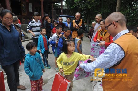 芦山佛图寺住持照空法师也代表佛图寺及芦山受灾民众感谢文殊院福慧功德会的爱心帮助。法师亲切地对孩子们说,好好读书,将来回报社会,像法师们一样慈悲。