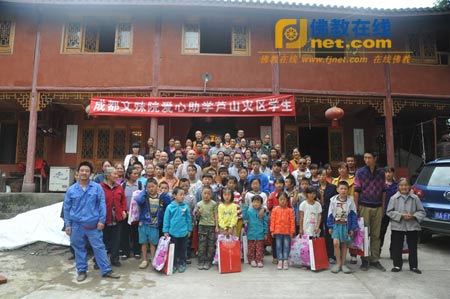 经过近4个月的筹备,由成都文殊院福慧功德会组织的“芦山灾区秋季爱心助学活动”于2013年9月8日正式启动。助学小组一行16名志工在福慧功德会负责人庆妙法师的带领下,前往雅安庐山佛图寺及上里箭杆林小学,不仅为芦山地震灾区75名贫困学生发放了助学金98700元,还赠送孩子们书包、文具、图书等学习用品,为他们的新学期送上爱的祝福,正式拉开文殊院的“9月慈善推广季”。