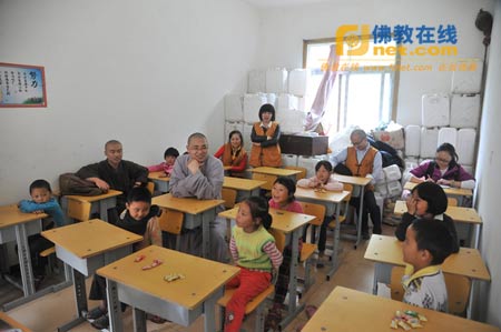 闵老师的20个孩子吵吵闹闹、蹦蹦跳跳地等待着助学小组的到来,庆妙法师和志工们也加入到孩子们天真、活泼的世界中,和他们一同坐在教室里玩游戏,吃糖果。一位志工老师给孩子们分享了一则关于“爱心”的故事,教导孩子们做一个有爱心的人,学会帮助身边的人。在孩子们的欢声笑语中,这堂“爱的教育”课非常生动。