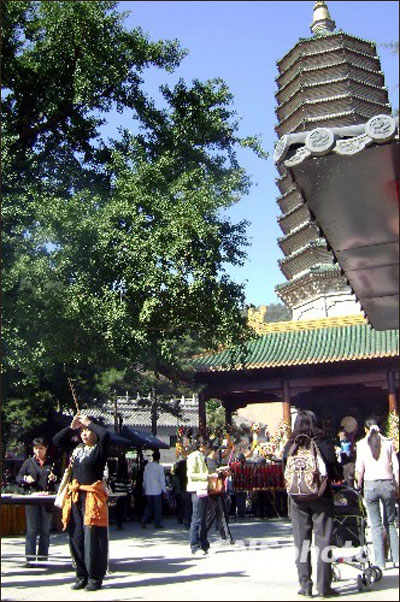 十四日清早,苍松翠柏掩映下,北京西山灵光寺香烟袅袅,红、黄两色布花与束束鲜花将八角十三层的密檐式舍利塔妆扮得分外喜兴;上千僧人、民众在近百位护法居士引领下礼拜、转塔。