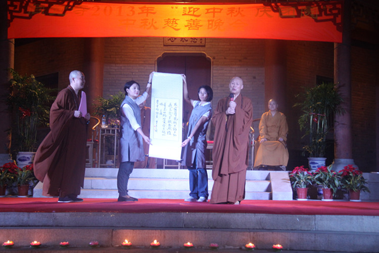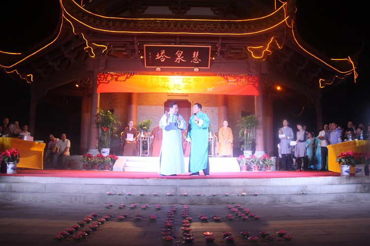晚上,同觉寺一年一度的中秋慈善晚会在习习凉风中与大家见面了。出席此次晚会的有香港东林念佛堂首座上觉下真长老和中国佛学院灵岩山分院副院长上弘下法长老、太仓市港区管委会副主任陈一飞先生、太仓市民族宗教事务局局长包炳祥先生、太仓市民族宗教事务局副局长朱文强先生、太仓市浮桥镇副镇长陆利璟先生、太仓市浮桥镇统战委员龚惠琴女士、徐州竹林寺方丈明道大和尚尼。近1000位周边群众也不约而同恭襄盛会。