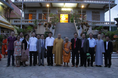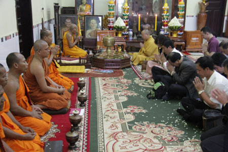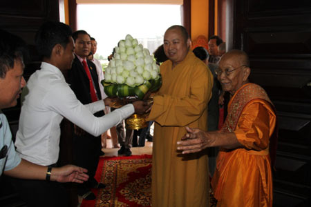 当天下午,在柬埔寨王国宗教部官员的陪同下,印顺法师一行拜访了柬埔寨僧王狄旺长老,并以中柬两国的佛教仪规诵经祈福。