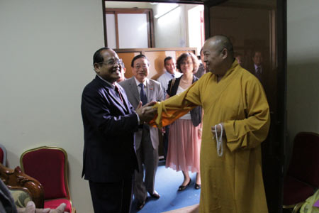 柬埔寨王国宗教部部长孟肯与印顺法师亲切握手