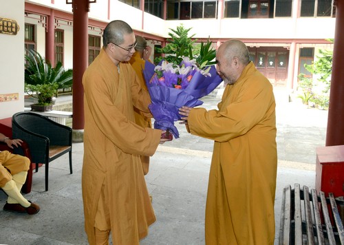 9月24日上午,受会长道慈大和尚委托,佛协办公室主任真常法师,以及办公室干事昌其法师、门仁法师等一行,前往杨枝禅林分别为体觉长老71岁寿诞和礼求长老庆祝82岁寿诞,先后与杨枝禅林副监院慧光法师等一起,祝愿老人家健康长寿,吉祥如意,并送上鲜花、贺卡及贺仪。