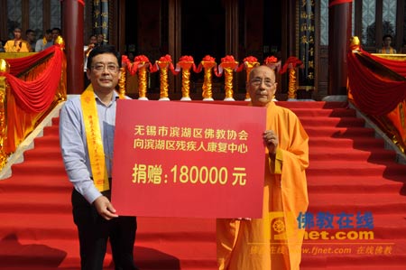 滨湖区佛教协会名誉会长无相长老现场向滨湖区残疾人康复中心捐善款18万