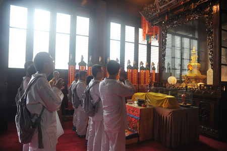下午一点,顶着热辣的太阳,怀着崇敬和期盼,营员们在藏经楼参拜了玄奘法师这位没有一分钟为自己、却用一生践行佛法的伟大修行者的顶骨舍利。玄奘法师的舍利在金色的灵塔内绽放华光,虔诚参拜的营员们似乎也感受到了这位高僧来自大唐的神圣气息,带动着每一位营员更加向善向上的决心。