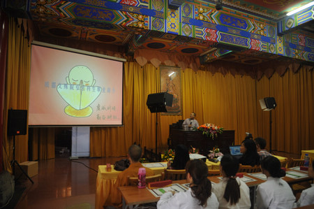 下午两点,成都文殊院弘法利生部主管庆妙法师主持了一场精彩的“弘法推介会”。他介绍了文殊院践行“人间佛教”以来开展的许多丰富多样的活动,并欢迎广大营员踊跃参加到文殊院的三大弘法利生团体(青年佛学会、志工团、福慧功德会)中来。