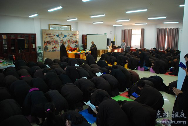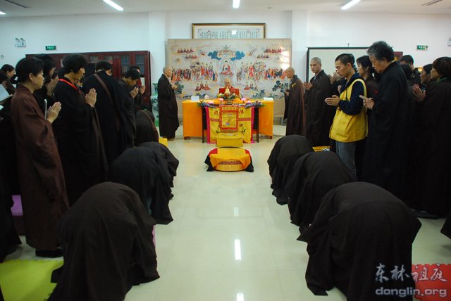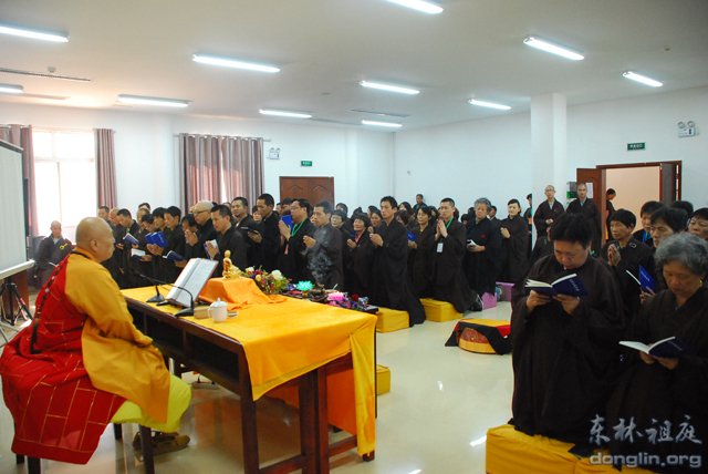 10月4日上午,正在举办首次佛七的东林寺净土苑,迎来又一件因缘殊胜的法事——隆重举行三皈五戒法会。东林寺方丈和尚大安法师应净土苑信众之请,不顾连日的劳碌,慈悲为130多位求受三皈五戒的净业行人传授三皈五戒。