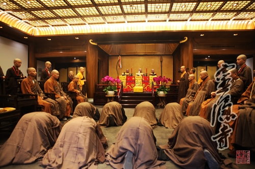 下午14时,在开堂大师傅及诸引礼师的教授下,新戒们在法堂练习登坛仪,为明日正式登坛受具足比丘戒演仪。