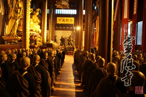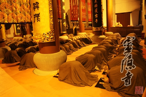 晚上,戒子们在药师殿聆听教授和尚中国佛教协会常务理事、浙江省佛教协会会长、雪窦寺方丈怡藏大和尚开示,并在开堂大师傅的引信下,拜愿忏摩通宵。