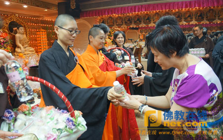 法师向参会的居士信众发放饮品