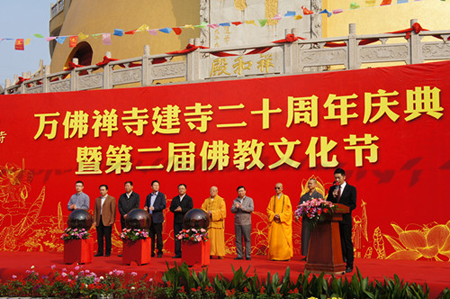 2013年10月20日,江苏省常州市新北区春江镇万佛禅寺举行建寺20周年庆典暨第二届佛教文化节活动。常州市委统战部副部长、市民宗局局长赵世平,市佛教协会会长、天宁禅寺方丈松纯长老,新北区委常委、宣传统战部部长杨光,市民宗局副局长颜良进,区民宗局局长茅雪鹤等众多嘉宾到场祝贺。