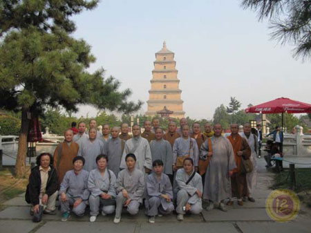 最后一站是朝礼唯识宗祖庭大慈恩寺,师生们在大雁塔下称诵观音菩萨圣号,绕塔三匝,最后登至塔顶,祈愿风调雨顺,国泰民安。