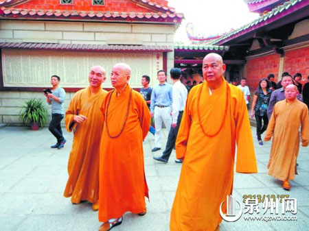 据悉,此次净心长老的泉州之行,是受向愿法师邀请。净心长老为台湾高雄光德寺现任住持,长期从事佛教教育与弘法工作,在台湾乃至整个佛教界德高望重,颇有影响。在佛教教育方面,1967年,他创办了净觉佛学院以培育佛教弘法人才,每届三年,毕业之学僧,均各弘法一方。又为提升僧才教育层次,培育高级弘法僧才,与泰国摩诃朱拉隆功大学合作,在光德寺创办净觉僧伽大学分校。(文:王丽虹)