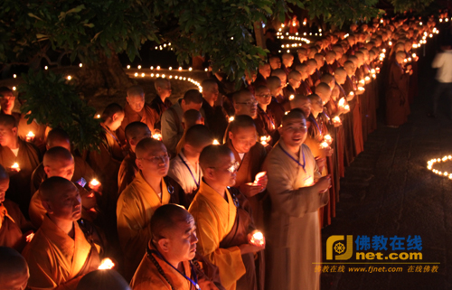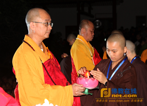 随后,与会的四众弟子将手中的莲花灯一盏盏传至广化寺天王殿前的莲花台上。灯灯交映,吉祥遍满,与会大众的心愿,萦绕在整个夜空,一盏盏心灯汇聚成一片灯海,一颗颗心凝聚成大众最美好的祈愿,以此祈愿三宝长久住世、普照人间,祈愿世界风调雨顺、和平安定,祈愿国家繁荣昌盛、民富国强,祈愿福建佛学院为佛教输入更多的僧才。