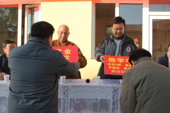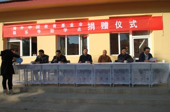在捐赠仪式上,上昌下义大和尚代表极乐寺助学点致辞,海外中国教育基金会卓运宝主席、学生代表、宜兴一中心校王磊校长,宜兴乡党委书记王俊军、科教局局长梁进军、政府副县长刘宝贵分别进行了讲话。