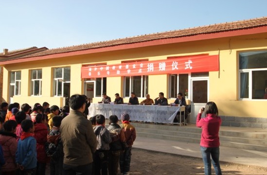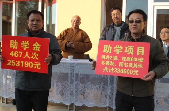 广灵县的气温逐渐地变得寒冷起来,但是向孩子们奉献的爱心却是热热的。2013年11月4日下午,上昌下义大和尚、释隆净法师、海外中国教育基金会卓运宝主席、李春英老师等一行7人来到了位于广灵县宜兴乡的西宜兴小学,在那里向广灵县12所中小学校捐赠课桌椅530套,讲桌100套,资助贫困学生467人次、助学金额253190元,为学校打吃水井2眼,冬暖装、图书及其他用品共计691790元。这样不仅改善了学校的教学条件,也为孩子们在这个寒冷的冬天送去了温暖。孩子是祖国的花朵、是祖国的未来,创造良好的学习环境,他们才会欢喜地去学习。从2000年开始至今共资助贫困学生3338人次,现金总额1051840元。