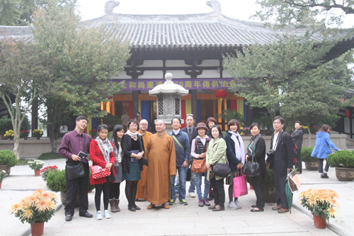 2013年11月3日上午,来自日本的追寻鉴真大和尚的足迹友好访问团到江苏省扬州市大明寺参观,受到了大明寺方丈能修法师的热情接待。