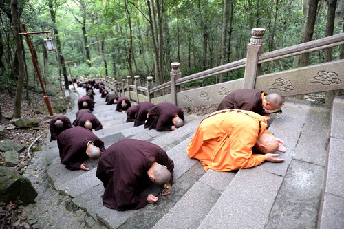 图4:道慈大和尚率领大众从法雨禅寺开始三步一拜朝礼佛顶山