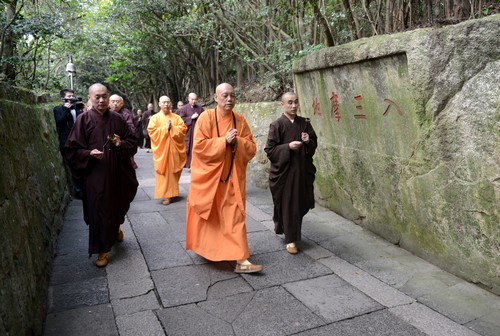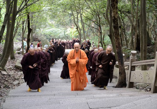 众法师、护法居士身着灰色海青,与光熙峰晚秋的缤纷色彩相辉映,显得和谐而肃穆。伴随着清脆悠扬的引罄声,道慈大和尚与众法师齐颂“南无大悲观世音菩萨”圣号,于香云古道第一台阶,五体投地虔心下拜,踏出第一步,开始了朝拜活动。众护法居士追随其后,三步一叩。大家无不抱着诚恳的愿心,向着佛顶和心中的观音菩萨去拜,山道蜿蜒,众人却不觉累,专注而虔诚,只为心灵的洗涤。圣号念诵声回荡在山间和清风松涛融为一体。朝拜队伍缓缓前进,一步一脚印向着普陀山最高的佛顶圣地进发。