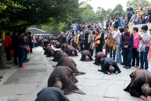 整个朝拜队伍秩序井然,在道慈大和尚的率领和维那师的引礼下,虔诚匍匐跪拜,清净庄严的威仪和纯净的道风引起朝山香游客一路的赞叹,大家自动退到路旁两侧,合掌随朝山大众一起讽诵大悲观世音菩萨圣号,深受感动的游客甚至跪在石板上,恭敬注视着朝山队伍静静通过。所有的人齐诵念着观音圣号,走三步再跪地一拜,表现出佛教的庄严及修行者的决心。山路上长长的朝山队伍,大家亲身历练去感受佛法、恭敬佛法、供养佛法。一路菩提,念念众生:在朝拜的过程中磨练着、成长着,成就着自己的道业,坚固着自己的道心。