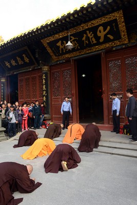 2013年11月4日,普陀山秋雨初霁,清新宜人;碧海青山,阳光普照。普陀山第十一届中国普陀山南海观音文化节“僧尼礼佛顶,万信齐朝拜”法会活动如序举行,全山各寺院执事、僧尼和护法居士、部分来山香游客300余人,于上午7时30分齐聚法雨禅寺,整肃威仪,场面恢弘壮观,气氛格外清净庄严。普陀山佛教协会副会长、慧济禅寺监院智宗法师主持法会。