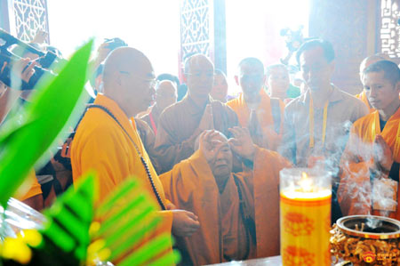 当日下午14点整,星云大师一行抵达南华禅寺曹溪山门,传正法师带领南华禅寺僧众在山门前热情迎接星云大师。星云大师与传正法师在禅海岸进行了亲切而友好的交流。星云大师表示,六祖惠能大师对中国佛教的影响很大,他不仅仅传承了一花五叶、五家七派,更是推动了人间佛教,此次到访南华寺,是为了传承和弘扬中国文化,进一步加强两岸禅宗文化交流与合作。他还说,今天能来到祖庭,能拜谒六祖惠能真身,算是遂了一生所愿。接着星云大师前往六祖殿拜谒六祖惠能真身。六祖殿中,星云大师一一向六祖惠能大师真身、憨山大师真身和丹田大师真身献上鲜花,并顶礼燃香,诚心礼拜。