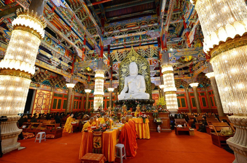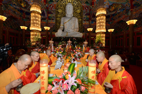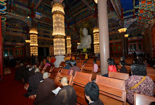 2013年11月12日晚,梅山寺举行瑜伽焰口法会。大雄宝殿内,坛场清净庄严,主法金刚上师拈香礼拜、端身正坐、头戴毗卢帽、心念意观、手结印契。台下,法师们唱腔淳厚、护法善信法喜充满、尽享法味。与会大众虔心礼诵,共同祈愿三宝加被,令此殊胜功德超荐历代祖先宗亲、累劫冤亲债主,以及十方法界一切幽冥众生离苦得乐、往生净土;并为生者消灾祈福。(图文:梅山寺)