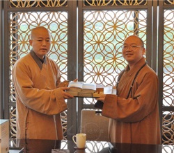 佛光山住持心保法师致赠纪念品,给予河北省佛教协会代理会长暨石家庄市柏林禅寺住持明海法师。