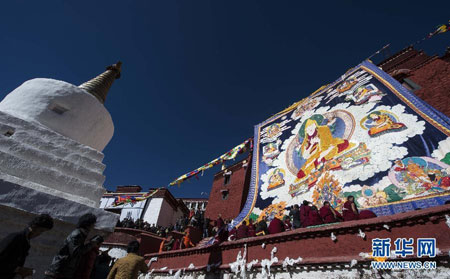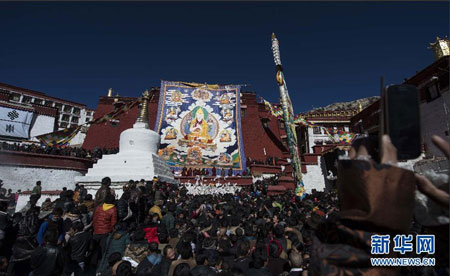 27日下午1时许,在藏传佛教格鲁派祖寺“甘丹寺”的宗喀巴金塔殿南墙上,一幅16.5米宽的宗喀巴大师堆绣唐卡徐徐展开,供信教群众朝拜,标志着一年一度纪念这位藏传佛教先驱的日子正式到来。