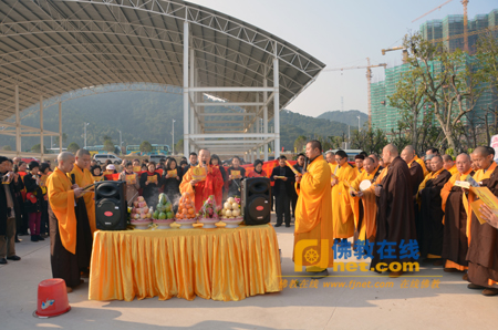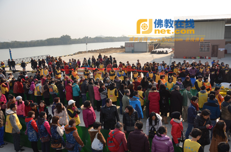 参加此次放生活动的近千名四众弟子,合十双手,虔诚而恭敬的站在空地前。