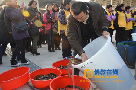 各种鱼类、田螺、乌龟、青蛙、蛇、螃蟹等多种水陆众生整齐的摆放在空地上的水桶,水箱,袋子及货车里,等待着法师及善信居士们举行皈依仪式并放生。