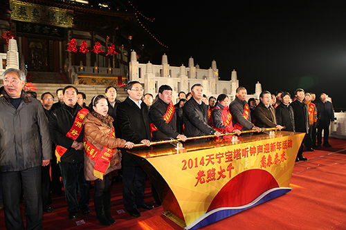 “光照大千,万象泰来”2014天宁宝塔听钟声迎新年活动昨晚举行。随着天宁禅寺敲响第108记祈福钟声,时针指向2014年1月1日零时,市委书记阎立和市委副书记、代市长费高云与我市“好人”代表们共同为宝塔亮灯,迎接新一年的到来。