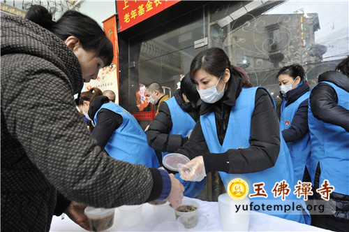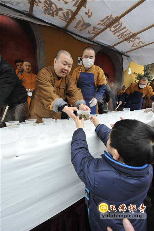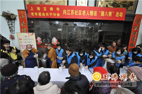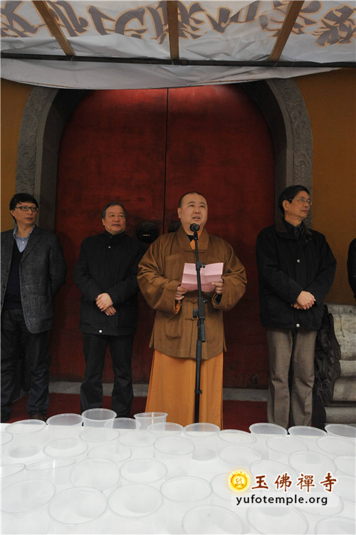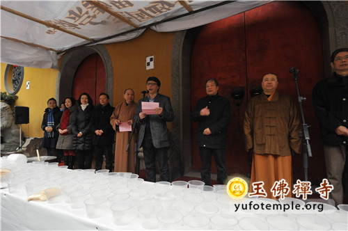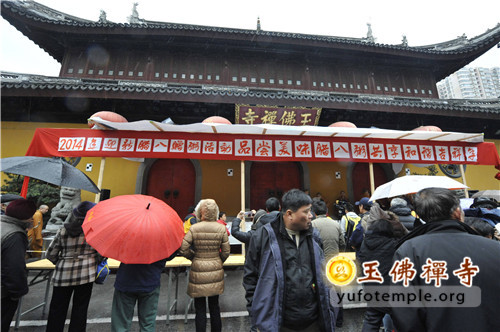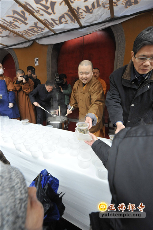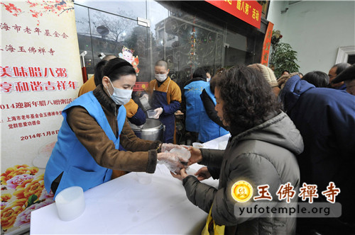 2014年1月8日,农历腊月初八,是佛祖释迦牟尼成道的纪念日,也是中国传统的腊八节。上海玉佛禅寺一年一度的“品尝美味腊八粥,共享和谐吉祥年”向社会大众施赠腊八粥活动在寺院山门前举行。中国佛教协会副会长、上海市佛教协会会长、玉佛禅寺方丈觉醒大和尚,中共上海普陀区委统战部副部长、区民宗办主任张华、市老年基金会领导以及社会大众约2500余人参加了今天的现场施粥活动。