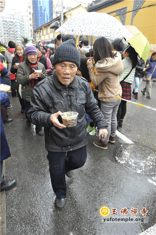 今年的活动跟去年一样,由上海市老年基金会和玉佛禅寺共同主办的,寺院不仅在山门前举行现场赠粥活动,同时也将这一吉祥的腊八粥赠送到本市的长宁、虹口、黄浦、静安、闵行、浦东、普陀、徐汇、杨浦和闸北的社区生活中心、敬老院等地方。今天天空虽然下着绵绵细雨,但仍阻挡不了信众品尝腊八粥的热情,大家早早的就来到寺院门前排队,队伍沿安远路、江宁路一直延伸到近长寿路,不到两个小时,现场赠送的2500份粥就发完了。