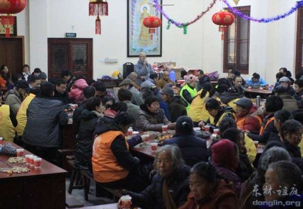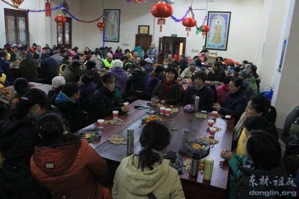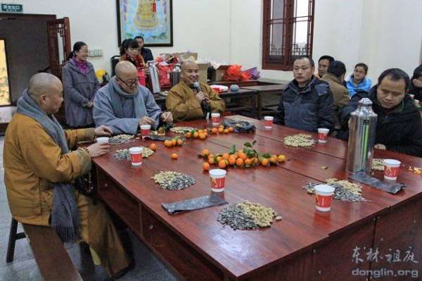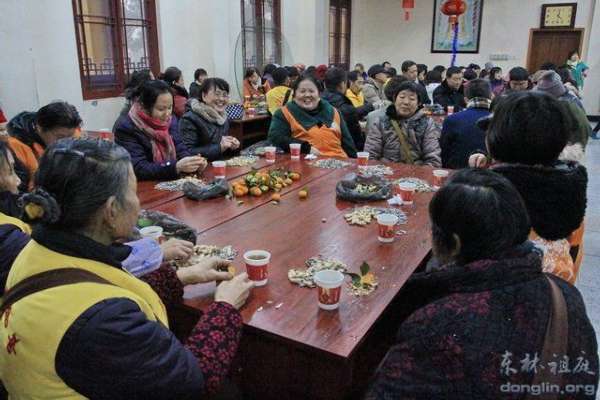 另,2014年1月8日中午,腊八施粥活动结束后,100多位来自九江市、九江县、星子县等地的东林慈护的志愿者们,欢聚在东林寺老五观堂二楼,参加由东林寺慈善护生会举办的新年茶话会。东林寺慈善护生会会长本通法师、副会长德日法师和主管护生的慧悦法师出席了茶话会。